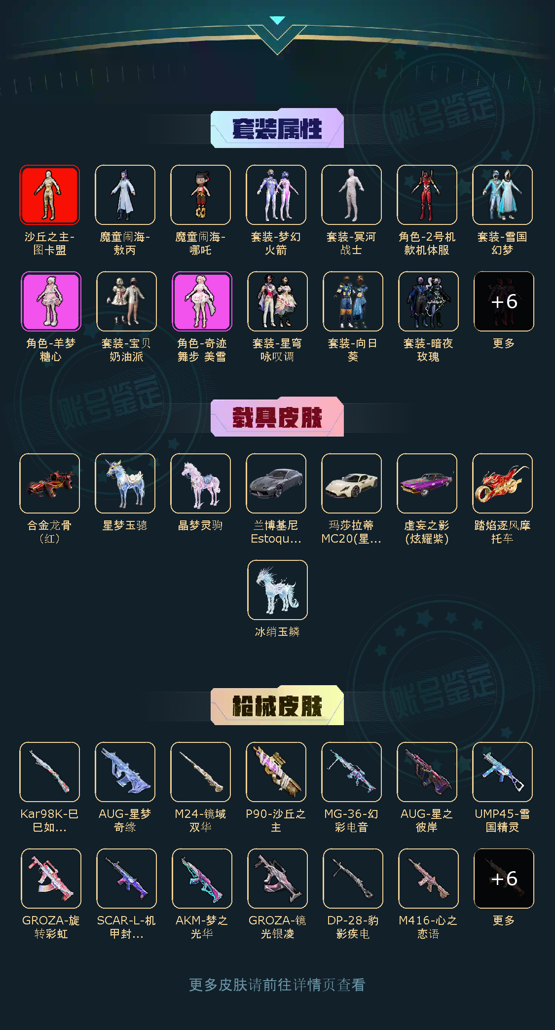 【稀有资产】沙丘之主-图卡盟[4级]/角色-魔童闹海-敖丙[2级]/角色-魔童闹海-哪吒[1级]/角色-2号机款机体服/套装-雪国幻梦/角色-千金淑猫/角色-羊梦糖心/M416-心之恋语/AUG-星之彼岸/AKM-梦之光华/AUG-星梦奇缘/M416-墨龙九天/SCAR-L-魔童闹海 哪吒/角色-零款战斗服/角色-真嗣款战斗服/熔岩游骑兵面罩/小恶魔头饰/木乃伊套装/套装-奇异狩猎者/套装-暗夜魅影/套装-粉红小猪/套装-浪漫天命/套装-雪山精英/套装-暗影哥特/套装-龟仙人/套装-晶辉守护/套装-绒宝小鹅/套装-净心行者/套装-狂沙舞者/套装-东方飞龙/角色-粉雾星云/角色-摩登魅猫/角色-许七安/角色-俏兔智灵/角色-海琴烟/信号枪-彩虹独角兽