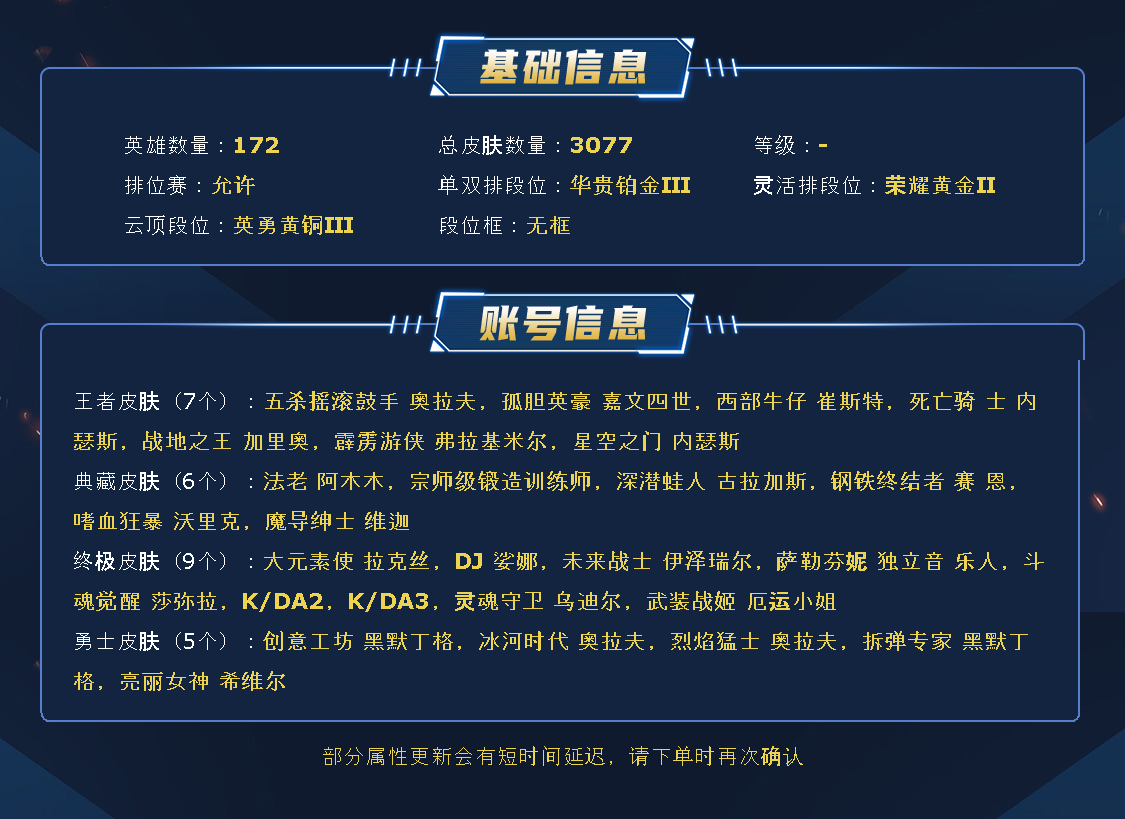 黑色精选号,3000皮、1569原皮、1488炫彩,8色龙瞎。海量限定皮肤,基本全英雄都有大量皮肤,