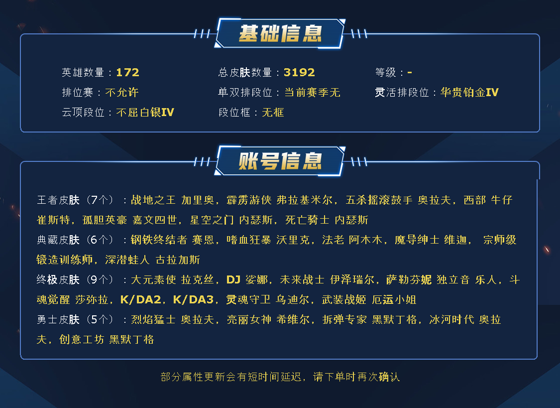 黑色玫瑰3100皮丨1671原皮丨不朽阿狸丨1514炫彩丨326限定丨131神话丨72臻彩