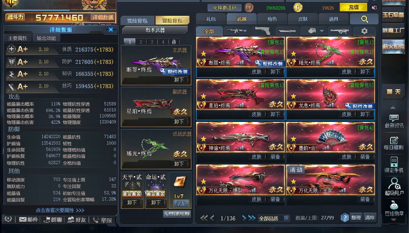 v12,区第三5900w,760w体力,两万金币,7w抗,6.1w穿。八千多狮子头,770w体力,断罪终焉满同步,瑶光满同步三强化, 命运满同步三强化, 巨阙满同步三强化,魔童典藏,星珀满同步异能典),天平异能典藏,墨韵满同步,ak天神满同步,最新武器#流影满同步,天平贰x2,晶刹贰x2,秩序贰x2,广陵贰x4,万象贰x4,魅影贰x3,两仪贰x4,玉衡贰x3,水晶贰x3。蝶舞#,连城x5,玄天x3,满同步滑稽3,