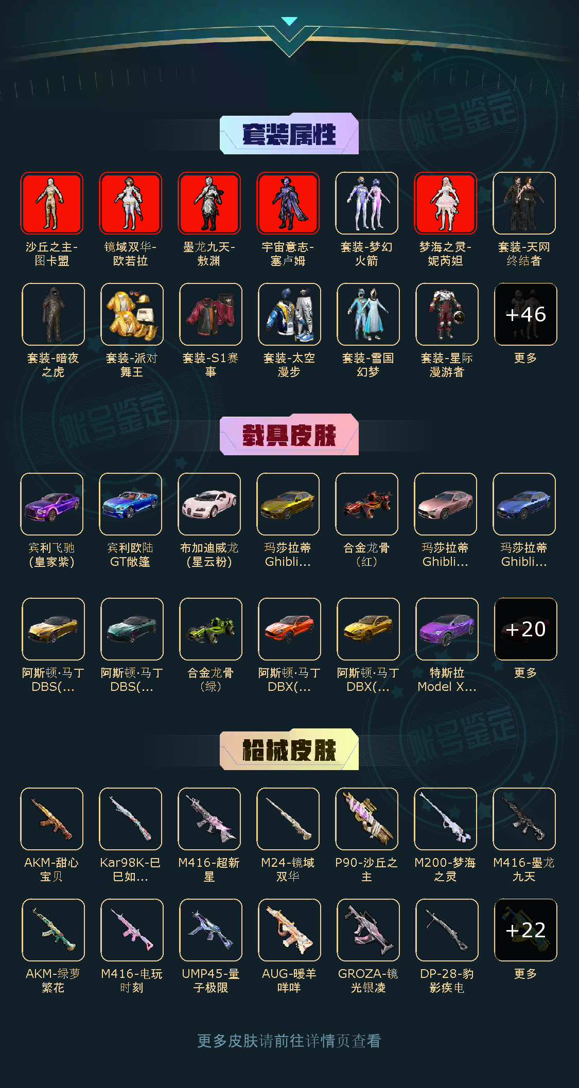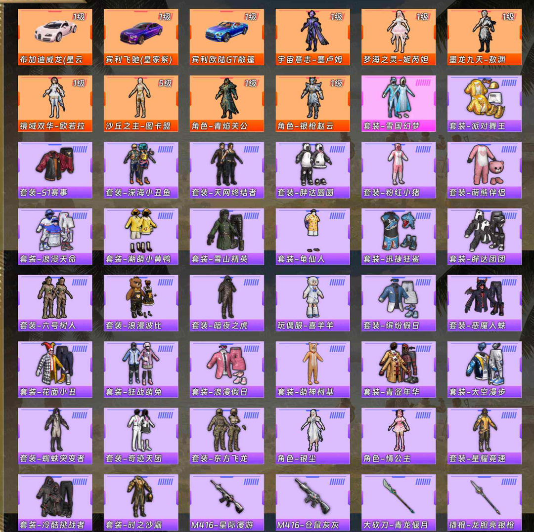 【热力值】300514 【历史最高段位】无敌战神 【王牌印记】13, 【稀有资产数量】64 【套装数量】462 【枪械数量】499 【粉枪械数量】35 【粉套装数量】47 【载具数量】33 【飞行器数量】18 【稀有资产】沙丘之主-图卡盟[5级]/宇宙意志-塞卢姆[1级]/梦海之灵-妮芮妲[1级]/墨龙九天-敖渊[1级]/镜域双华-欧若拉[1级]/角色-青焰关公[1级]/角色-银枪赵云[1级]/布加迪威龙(星云粉)[1级]/宾利飞驰(皇家紫)[1级]/宾利欧陆GT敞篷(深空蓝)[1级]/套装-雪国幻梦/套装-星际漫游者/套装-缤纷油彩/M416-墨龙九天[8级]/AKM-甜心宝贝[5级]/AUG-暖羊咩咩[5级]/M416-电玩时刻[5级]/AUG-超新星[4级]/SCAR-L-梦幻火箭[4级]/M416-超新星[3级]/M416-五爪金龙[1级]/M416-心之恋语[1级]/熔岩游骑兵面罩/小丑红鼻头/小恶魔头饰/套装-派对舞王/套装-S1赛事/套装-深海小丑鱼/套装-小丑鱼/套装-天网终结者/套装-胖达圆圆/套装-粉红小猪/套装-萌熊伴侣/套装-浪漫天命/套装-潮萌小黄鸭/套装-雪山精英/套装-龟仙人/套装-迅捷狂鲨/套装-胖达团团/套装-六号树人/套装-浪漫波比/套装-暗夜之虎/套装-缤纷假日/套装-恶魔人蛛/套装-花面小丑/套装-狂战萌兔/套装-浪漫假日/套装-萌神柯基/套装-青涩年华/套装-攀登者/套装-太空漫步/套装-蜘蛛突变者/套装-奇迹天团/套装-东方飞龙/套装-星耀竞速/套装-冷酷挑战者/套装-时之沙漏/玩偶服-喜羊羊/角色-银尘/角色-情公主/M416-星际漫游/M416-仓鼠灰灰/大砍刀-青龙偃月刀/撬棍-龙胆亮银枪 【粉色套装】套装-极限特训/套装-快乐主宰/套装-幻影战神/套装-数码大师/套装-银河战甲/套装-宝贝奶油派/套装-天使彩虹糖/套装-深渊皇后/套装-金曜白虎/套装-木曜青龙/套装-土曜战麒/套装-水曜玄武/套装-火曜朱雀/套装-古堡领主/套装-守护骑士/套装-梦幻火箭/套装-星之信仰/套装-蝶舞迷情/套装-天启纪元/套装-麻辣鲜香锅/套装-铁甲悍将/套装-金属狂野/套装-静灵氛围/套装-智能音符/套装-放客神游/套装-天禅智恒/套装-彗云及圣/套装-狩月元帅/套装-琉璃脉冲/套装-新星烈龙/套装-迷蝶贵族/套装-幻彩马卡龙/套装-极致幻想/套装-星空之魅/套装-心之恋语/套装-俏皮狐尾/套装-炙焰红王/套装-暗翼战神/套装-苍蓝魅影/套装-翡翠骑士/套装-绚金战神/角色-洛天依/角色-守护天翼/角色-异瞳寒姬 【粉色枪皮】GROZA-香水柠檬[5级]/AKM-绿萝繁花[5级]/GROZA-镜光银凌[5级]/Kar98K-巳巳如意[5级]/UMP45-量子极限[5级]/DP-28-豹影疾电[5级]/M762-激战未来[4级]/Kar98K-暗翼战神[4级]/SKS-诡面斩[4级]/M24-星之信仰[4级]/SCAR-L-锦绣绵绵[4级]/AWM-花间之火[4级]/Mini14-荧光虫舞[4级]/DP-28-扶摇飞仙[4级]/M762-甜蜜誓约[3级]/M24-镜域双华[3级]/UMP45-宇宙意志[3级]/UMP45-雪国精灵[3级]/P90-沙丘之主[3级]/AKM-炫紫旋律[2级]/Mini14-龙虾霸霸[2级]/SCAR-L-童趣迷兔[2级]/M200-梦海之灵[2级]/Mk14-福马献瑞[2级]/MG3-酷泡奶龙[2级]/Kar98K-伏魔团[1级] 【载具】灵鼠银迹/萌喵橘座/特斯拉Model X(奇幻紫)/阿斯顿·马丁DBX(金)/阿斯顿·马丁DBX(蓝)/特斯拉Model X(珍珠白)/阿斯顿·马丁DBX(橙)/特斯拉Cybertruck(荒芜蓝)/特斯拉Cybertruck(极昼黑)/特斯拉Cybertruck(镭光铂)/玛莎拉蒂Ghibli(金)/阿斯顿·马丁DBS(绿)/阿斯顿·马丁DBS(金)/阿斯顿·马丁DBS(红)/玛莎拉蒂Ghibli(粉)/玛莎拉蒂Ghibli(蓝)/特斯拉Roadster(沁心粉)/特斯拉Roadster(尊享铂)/特斯拉Model 3(奇幻紫)/特斯拉Roadster(水滴蓝)/合金龙骨(红)/合金龙骨(绿)/快艇-塞莎KL27(霓虹粉)[1级]/双人摩托-双刃魅影(红)/双人摩托-双刃魅影(金)/疾风龙骑/双人摩托-梦幻火箭/照夜玉狮子/赤兔/拉轰鸭鸭车 【僚机】空客H135-恋语之翼 【飞行器】至尊龙雀飞行服/梦幻火箭飞行器/春暖花开飞行器/炫紫旋律飞行器/星之信仰飞行翼/神秘黑猫飞行器/古堡领主飞行器/心之恋语飞行翼/锦绣火鲤飞行器/龙翔九天飞行器[1级]/沙丘之主天马[1级]/镜域双华-灵镜之阶/幻海精灵飞行器[1级]/水晶纸鸢飞行器/深渊漩涡飞行器/炫彩糖果飞行器/电糖天使飞行器[1级]/极意拳锋飞行器 【珍稀背包】百万伏特背包(3级)/百万伏特背包(2级)/百万伏特背包(1级)/萌熊伴侣背包(3级)/萌熊伴侣背包(2级)/萌熊伴侣背包(1级)/春暖花开背包(3级)/春暖花开背包(2级)/春暖花开背包(1级)/甜心宝贝背包(3级)/甜心宝贝背包(2级)/甜心宝贝背包(1级)/甜蜜誓约背包(2级)/甜蜜誓约背包(1级)/折纸暴龙背包(3级)/炫彩节奏背包(3级)/沙丘之主背包(3级)/折纸暴龙背包(2级)/沙丘之主背包(2级)/炫彩节奏背包(2级)/炫彩节奏背包(1级)/折纸暴龙背包(1级)/沙丘之主背包(1级)/ 【珍稀头盔】甜蜜誓约头盔(3级)/幻影战神头盔(3级)/宇宙意志头盔(3级)/香水柠檬头盔(3级)/雷霆特警头盔(3级)/墨龙九天头盔(3级)/梦幻火箭头盔(3级)/童趣迷兔头盔(3级)/梦海之灵头盔(3级)/甜心宝贝头盔(3级)/英勇胖红头盔(3级)/沙丘之主头盔(3级)/雪国精灵头盔(3级)/国宝胖达头盔(3级)/荒野猎神头盔(3级)/国宝胖达头盔(2级)/梦海之灵头盔(2级)/甜蜜誓约头盔(2级)/荒野猎神头盔(2级)/童趣迷兔头盔(2级)/宇宙意志头盔(2级)/墨龙九天头盔(2级)/英勇胖红头盔(2级)/幻影战神头盔(2级)/甜心宝贝头盔(2级)/雪国精灵头盔(2级)/雷霆特警头盔(2级)/梦幻火箭头盔(2级)/香水柠檬头盔(2级)/沙丘之主头盔(2级)/沙丘之主头盔(1级)/雷霆特警头盔(1级)/梦幻火箭头盔(1级)/梦海之灵头盔(1级)/国宝胖达头盔(1级)/英勇胖红头盔(1级)/墨龙九天头盔(1级)/宇宙意志头盔(1级)/雪国