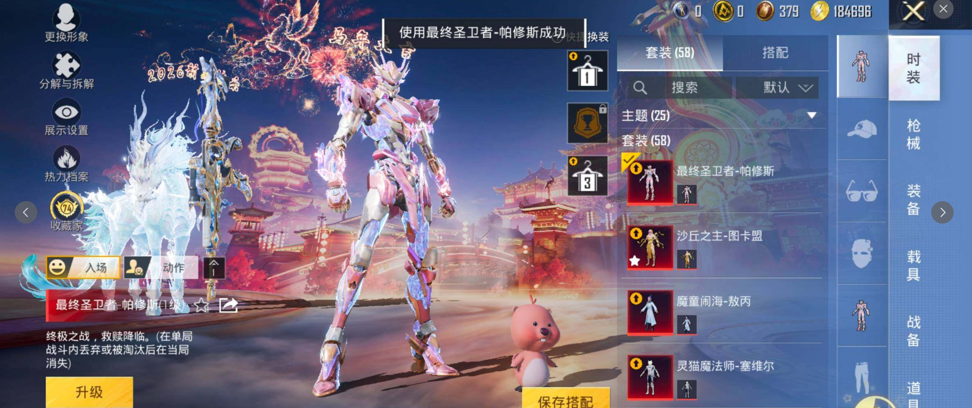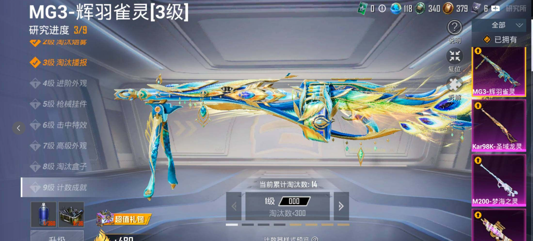 【12特效枪】 P90-魔童闹海敖丙 (3级) SCAR-L-魔童闹海哪吒 (3级) M416-灵猫魔法师 (3级) P90-冷漠罗丽 (6级) P90-沙丘之主 (3级) Kar98K-圣域龙灵 (3级) MG3-辉羽雀灵 (3级) Vector-最终圣卫者 (3级) DP-28-豹影疾电 (5级) M200-梦海之灵 (3级) Mk14-福马献瑞 (5级) PKM-萌骑夺宝 (4级)